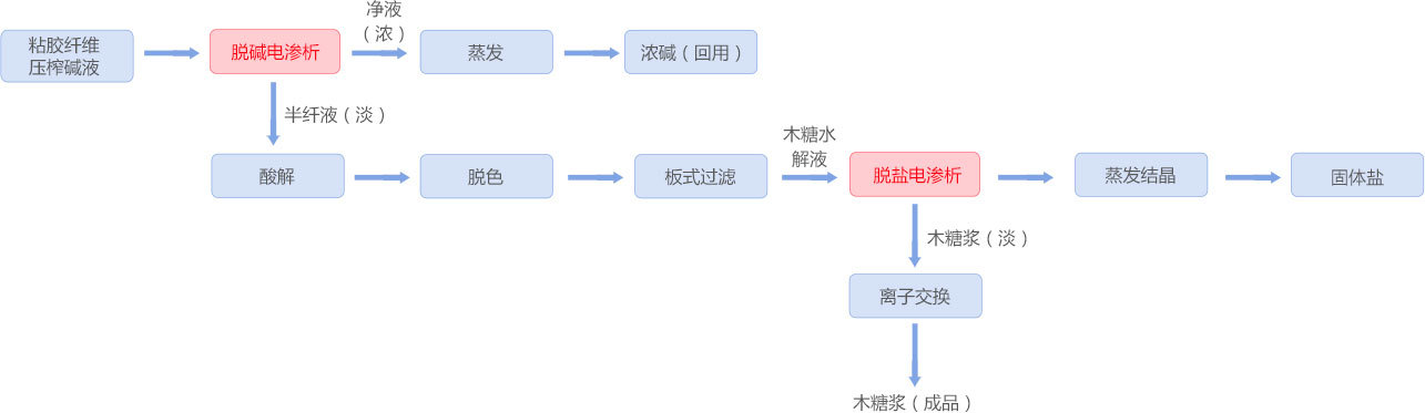 粘膠纖維生產(chǎn)過程中產(chǎn)生大量壓榨廢堿液,以前轉(zhuǎn)移到污水處理廠用酸中和,不僅產(chǎn)生大量固廢,而且造成資源浪費(fèi)。采用均相膜電滲析裝置,壓榨堿液經(jīng)電滲析脫堿回用,脫堿后的半纖經(jīng)酸解、電滲析脫鹽凈化后生產(chǎn)木糖,該工藝是工業(yè)廢棄物資源化利用并實(shí)現(xiàn)廢水零排放的典型案例。該項(xiàng)目已連續(xù)運(yùn)行兩年,全年可實(shí)現(xiàn)20萬(wàn)噸高含量半纖維素堿法漿處理回用,對(duì)傳統(tǒng)產(chǎn)業(yè)工藝綠色化改造具有重要意義。