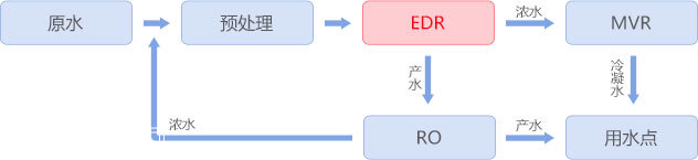 電鍍廢水由于其水質復雜,各類重金屬、COD含量較高,一直是膜濃縮工藝中的難點,采用均相膜電滲析裝置有效的解決了此問題,原水經(jīng)沉降、氧化、超濾預處理后進入電滲析濃縮, 達到12%后進入MVR蒸發(fā),淡水經(jīng)反滲透處理后回用,電鍍廢水得到有效處理,達到近零排放。