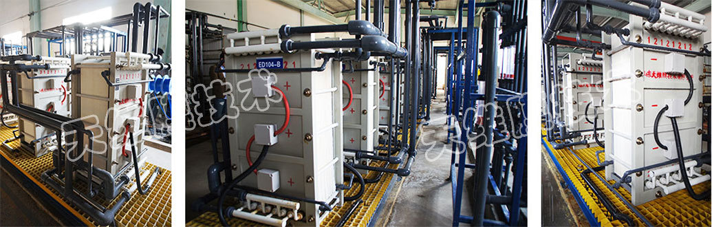 (1)有機(jī)酸生產(chǎn):有機(jī)酸生產(chǎn)過(guò)程中需要轉(zhuǎn)化有機(jī)酸鹽為有機(jī)酸;傳統(tǒng)方法采用離子交換,離子交換柱再生過(guò)程消耗大量酸產(chǎn)生大量含鹽廢水;利用雙極膜電滲析水解離作為H+和OH-的供應(yīng)源,可直接生產(chǎn)有機(jī)酸,無(wú)需外加酸,副產(chǎn)堿,簡(jiǎn)化了工藝,避免了環(huán)境污染。 (2)食品醫(yī)藥工業(yè):雙極膜電滲析水解離產(chǎn)生的酸和堿用于食品和醫(yī)藥行業(yè)生產(chǎn)過(guò)程中的pH值在線調(diào)整,無(wú)需外加酸和堿,不引入外來(lái)成分。 (3)環(huán)境保護(hù):雙極膜電滲析水解離作為新型膜分離過(guò)程,可在不引入新組分的情況下將水溶液中的鹽轉(zhuǎn)化成相應(yīng)的酸和堿,為某些物質(zhì)資源的再生和回收、減少?gòu)U物排放、消除環(huán)境污染提供了新的途徑 項(xiàng)目現(xiàn)場(chǎng)